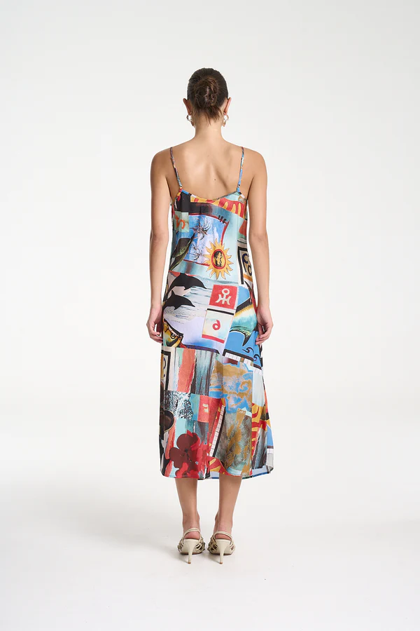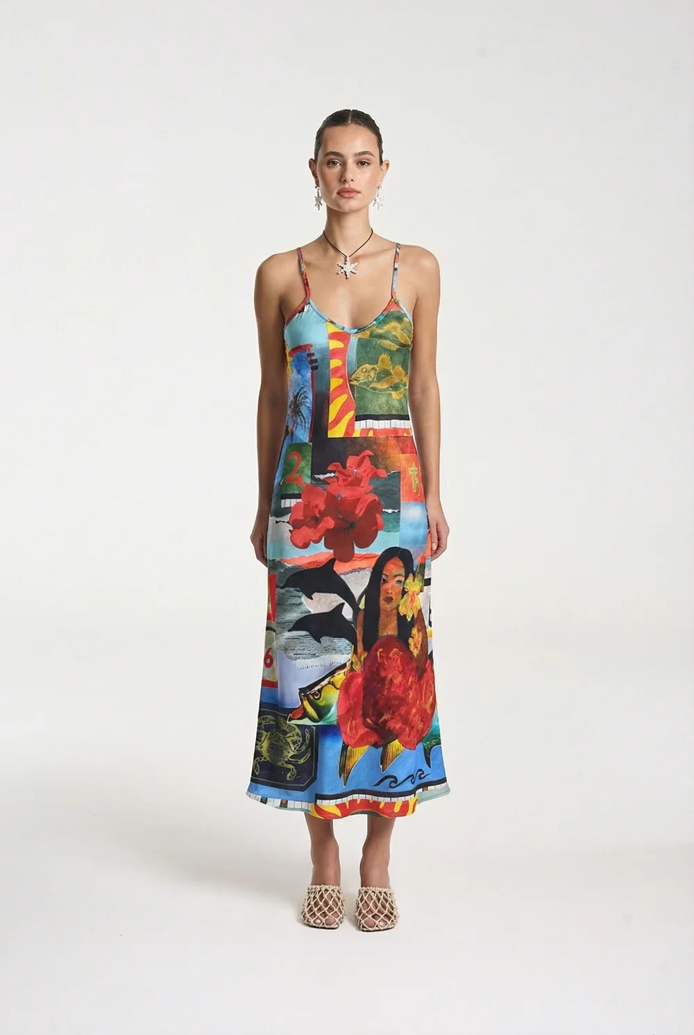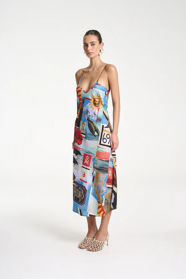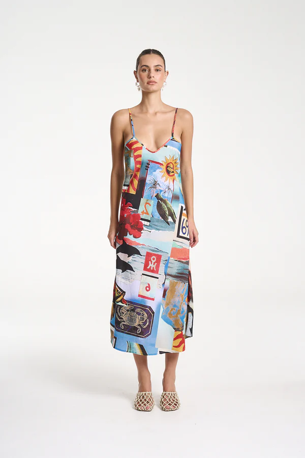 The Siren Midi Dress showcasing the mixed media Loco artwork is a classic, lightweight and flattering midi dress with a v-neck-line and adjustable straps.
