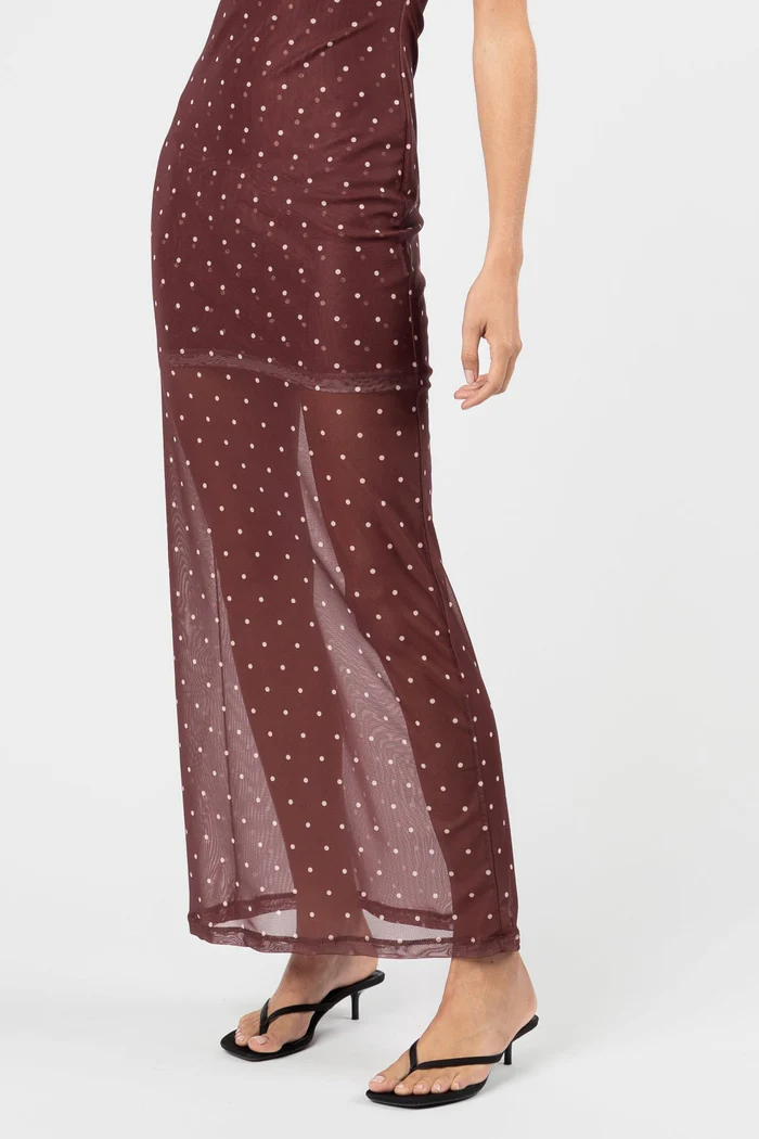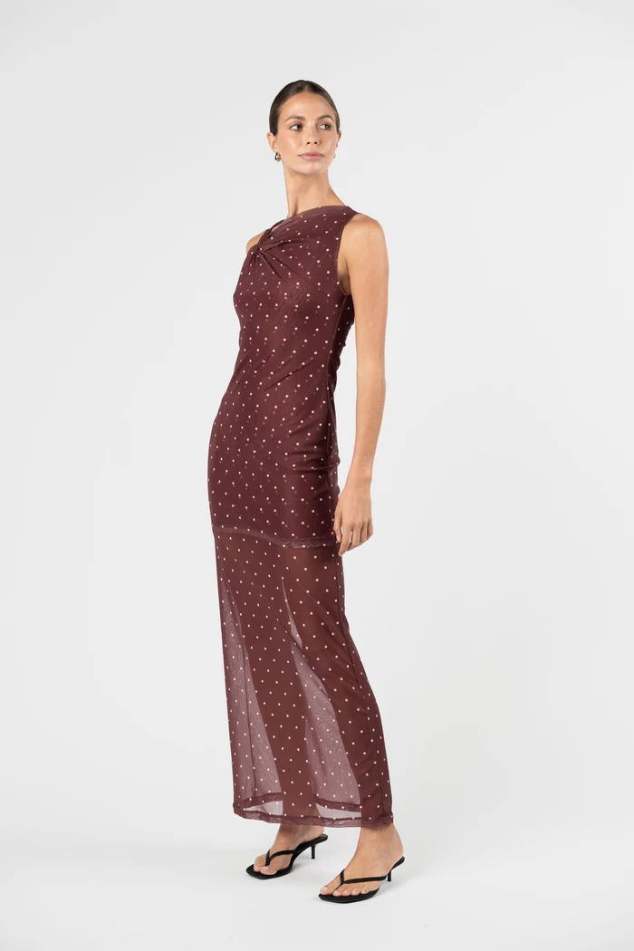 The Sora Knot Dress in Lola Dot Mesh revisits a One Fell Swoop classic with refined ease. Crafted from digitally printed stretch mesh, the silhouette features a softly draped knot detail at the neckline that flows seamlessly into a smooth, clean waistline. Fully lined in power mesh through the body for structure and comfort, the sheer lower section allows the printed mesh to fall freely for a light, fluid finish.