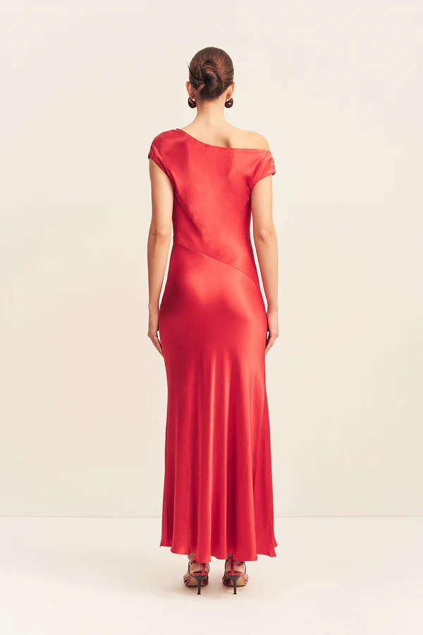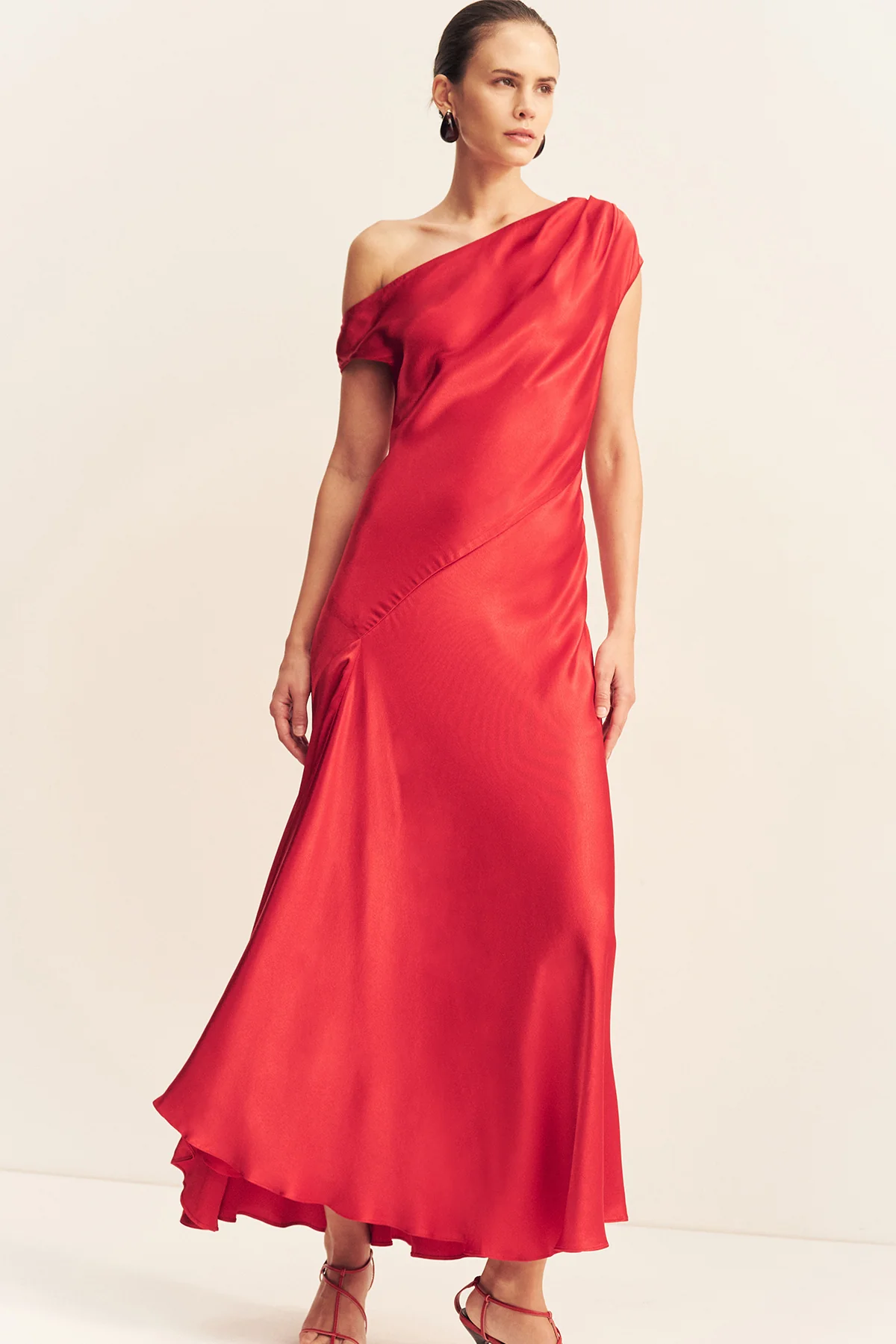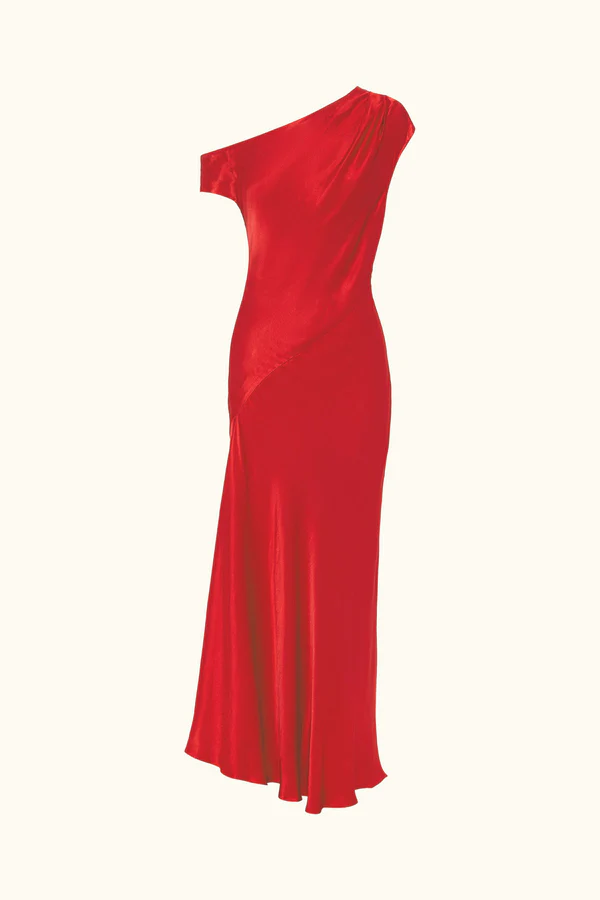Asymmetrical draped maxi dress in grenadine in a LENZING ECOVERO with a luxurious satin finish.