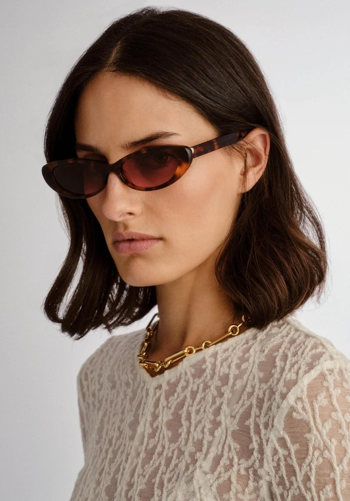 The Sonny – Tort offers minimalist chic with a sleek cat-eye design and signature LUV LOU x Whitney Port hardware, perfect for a refined, versatile look.