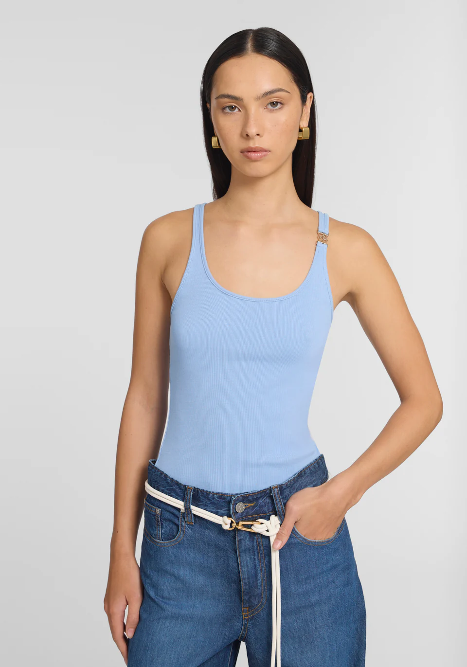 Bring new life to your everyday essentials with the Victor Tank, an elevated take on the classic tank top. Crafted from signature 2×2 organic cotton rib in a saltwater blue hue, this fitted silhouette showcases a flattering scoop neckline and sleek V&W hardware on the strap. The perfect starting point for any outfit, it exudes effortless luxury with every wear.