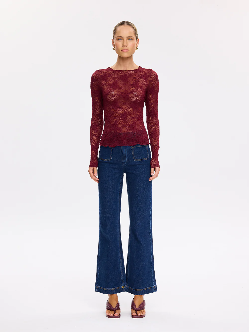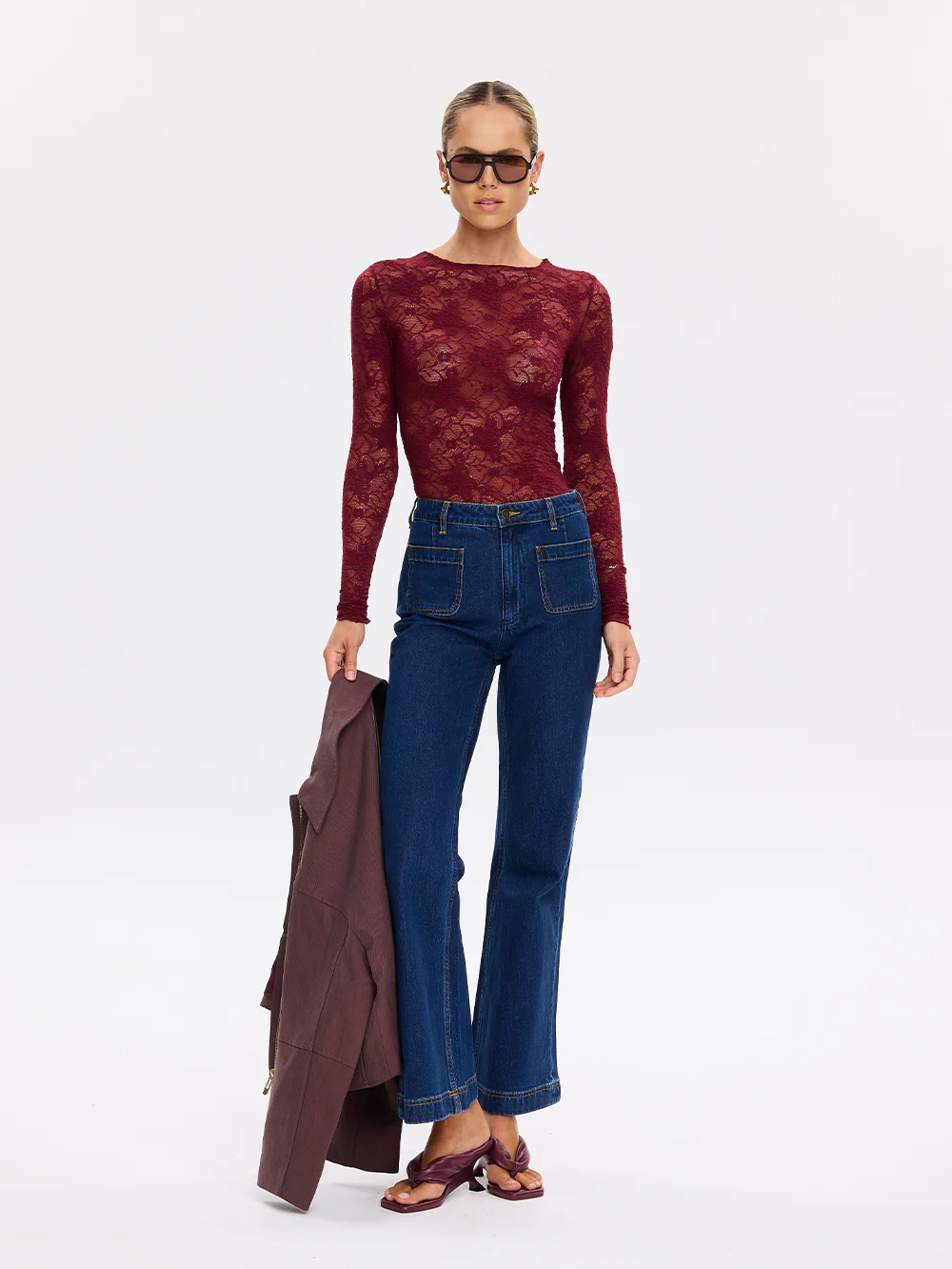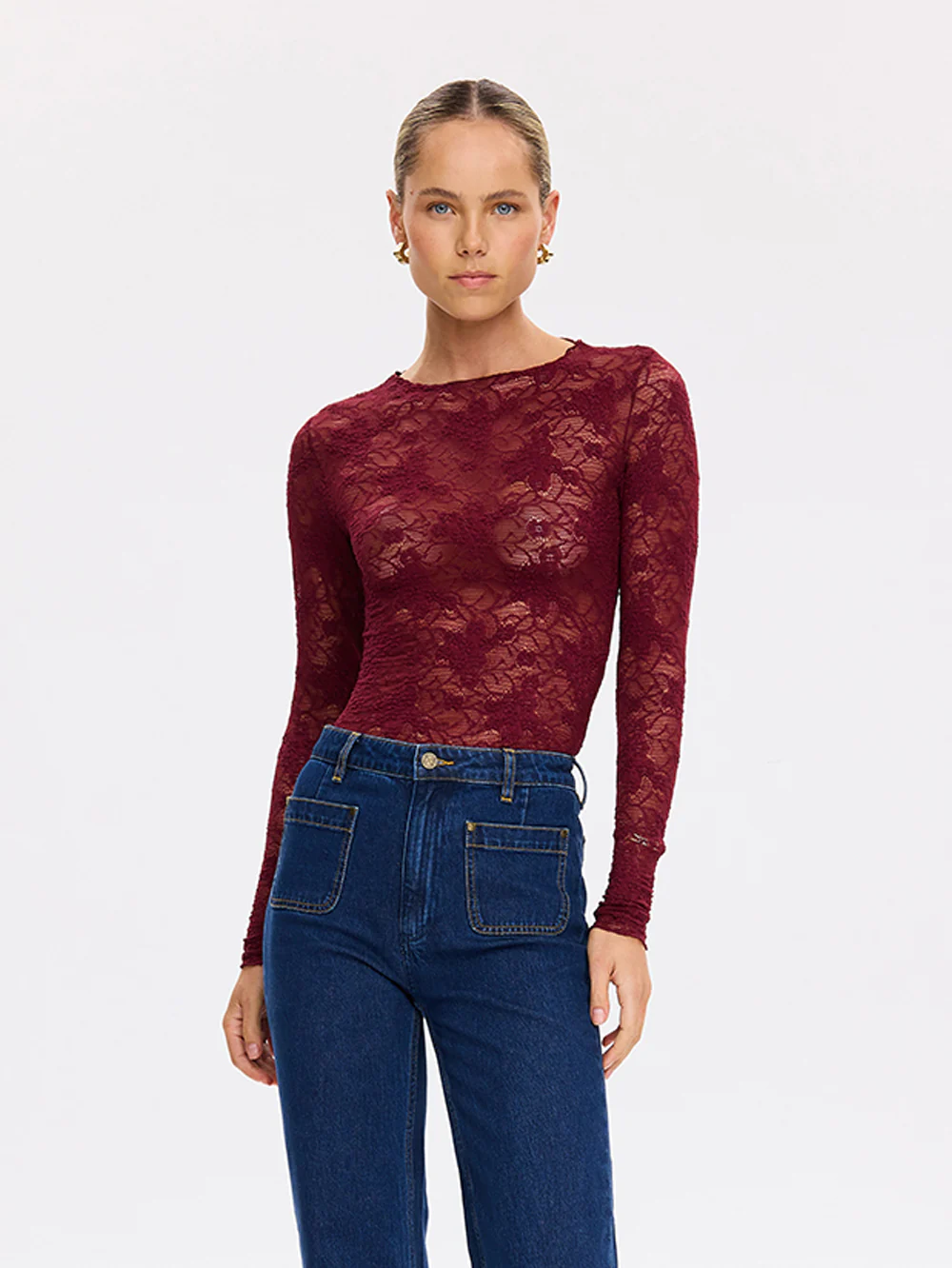 The Victoria Lace Top in plum is crafted in semi sheer stretch lace floral featuring a high neckline and full length slim sleeves. Pair back with a tailored pant and heels to elevate the look.