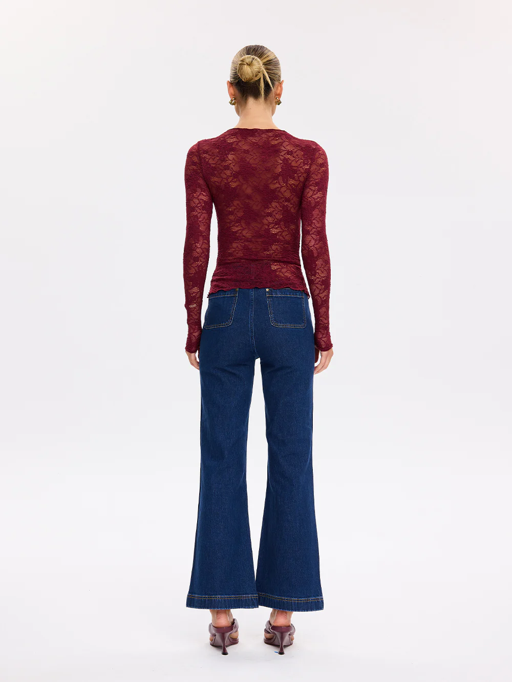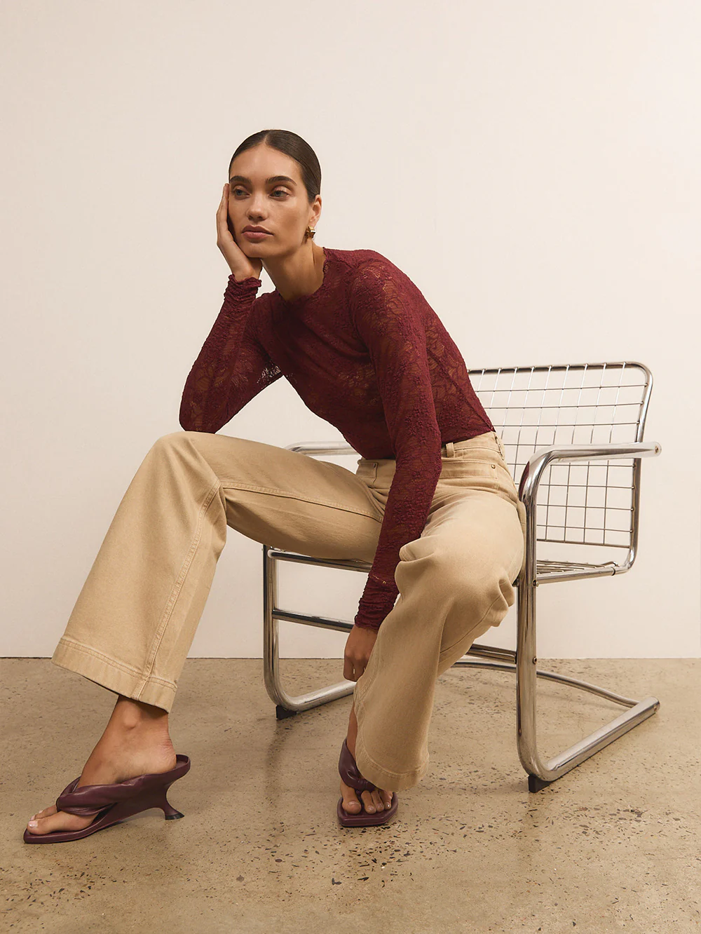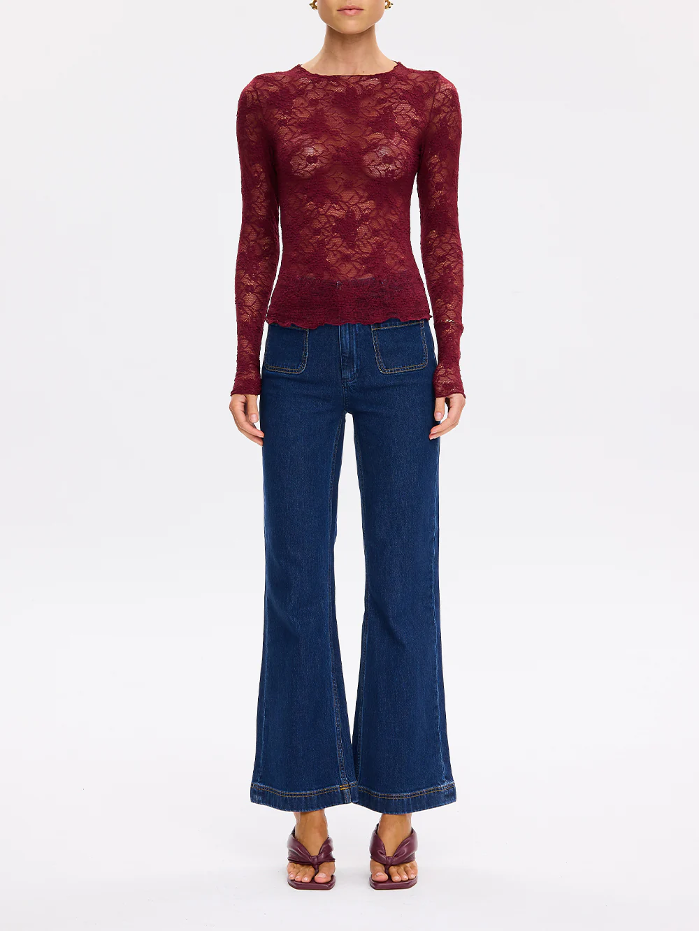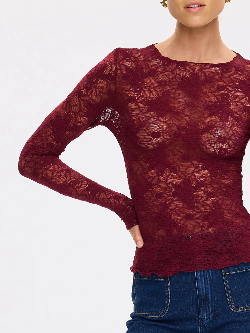 The Victoria Lace Top in plum is crafted in semi sheer stretch lace floral featuring a high neckline and full length slim sleeves. Pair back with a tailored pant and heels to elevate the look.