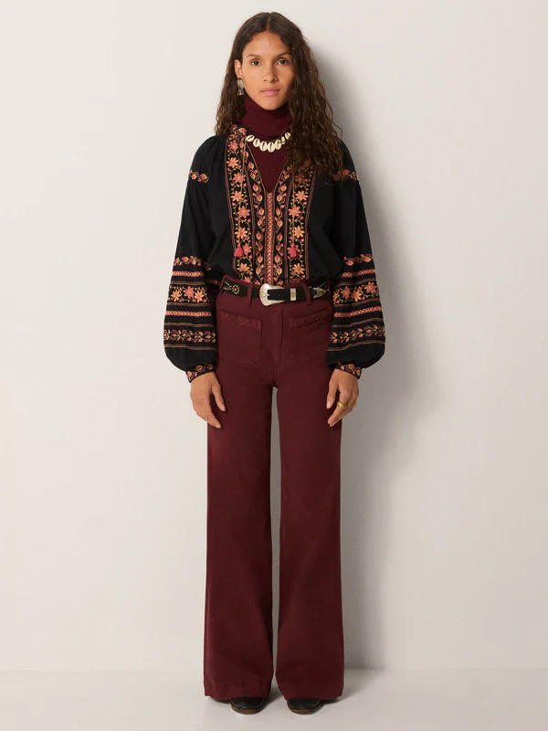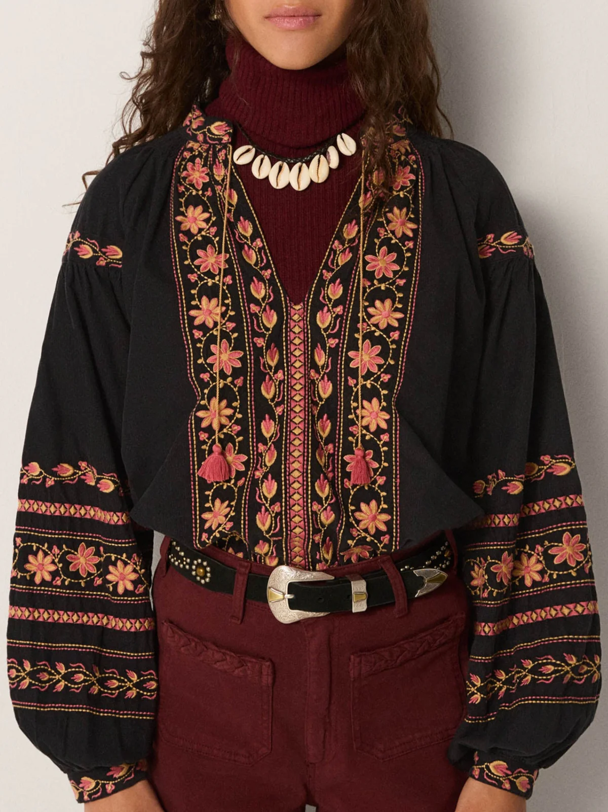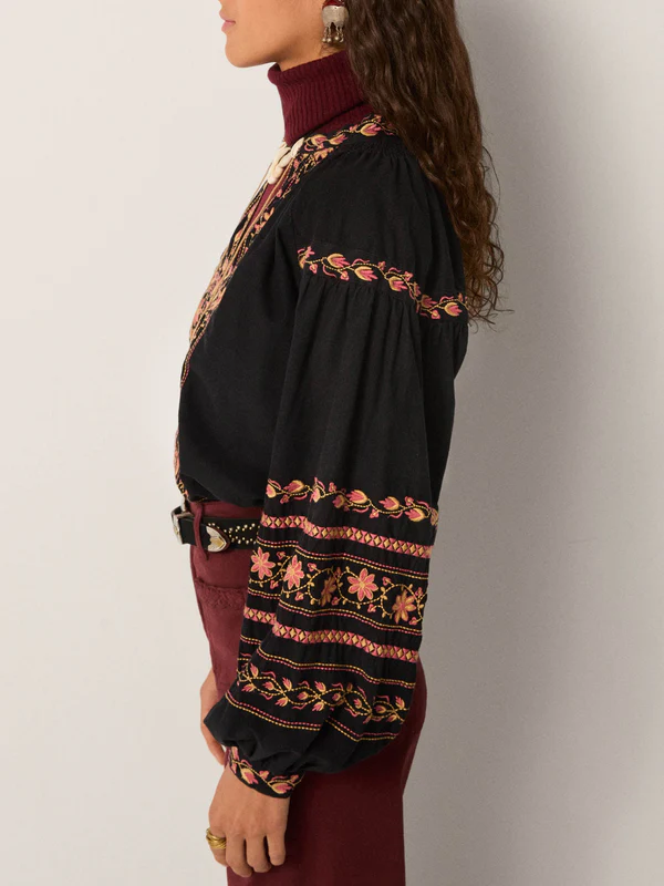 Florals in rose, grape and ochre climb across chest and sleeves, lit against a black ground. The embroidery is dense and intricate, resembling tapestry work both ornate and alive.