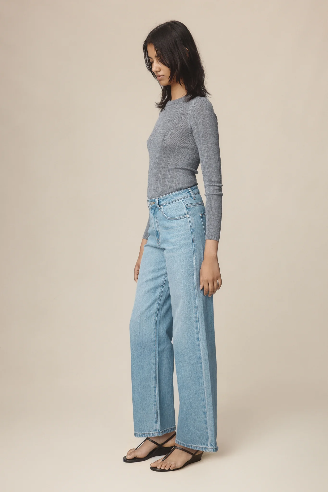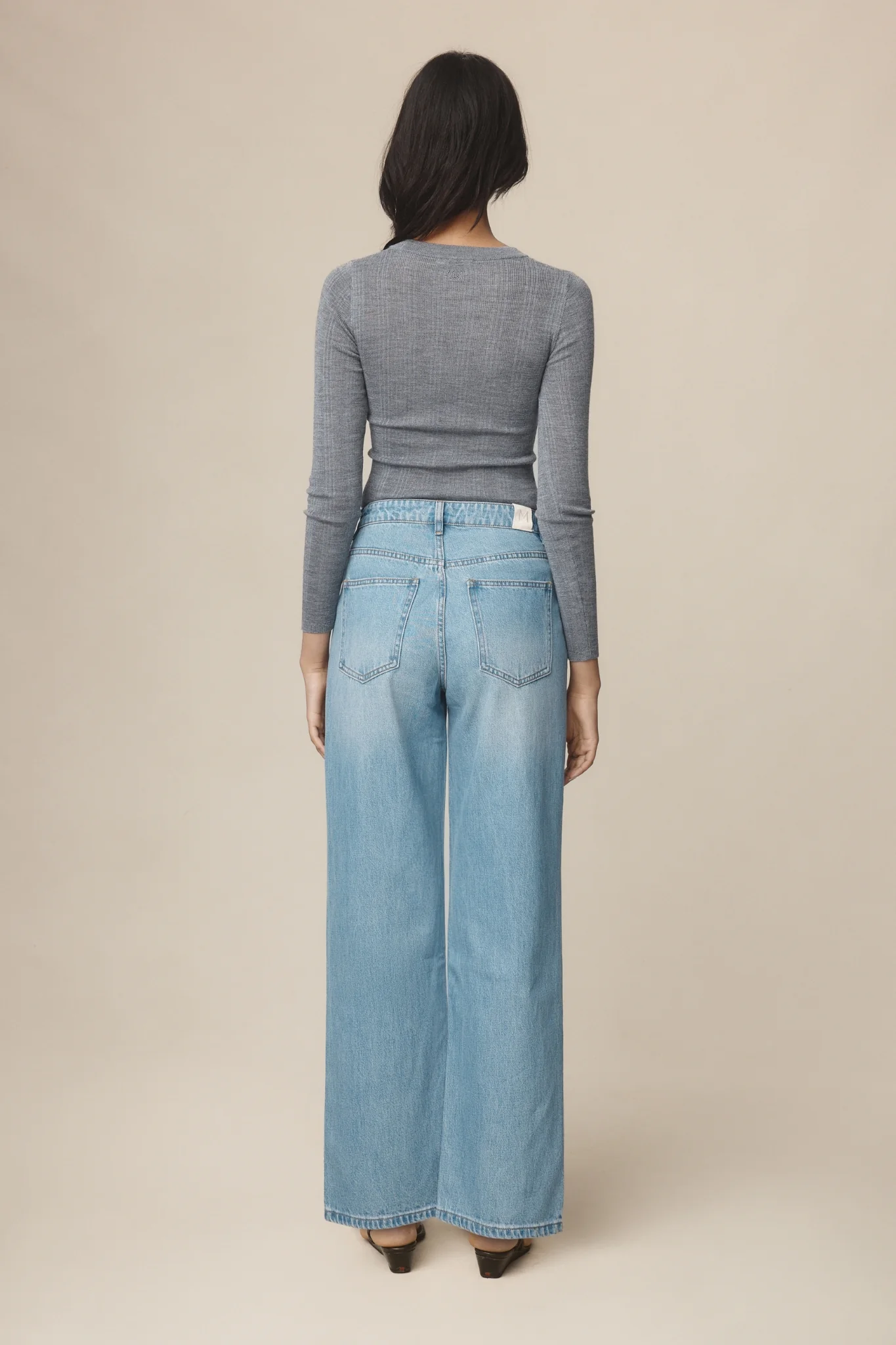 Washed for a soft hand feel, this jean is designed with a mid-rise waist and a full-length wide leg. The fit is relaxed through the hip and thigh, falling straight into a wide hem for a balanced, elongated proportion. Finished with a traditional waistband, belt loops and a zip fly with button closure. Classic five-pocket construction provides functionality, while reinforced topstitching throughout enhances durability.