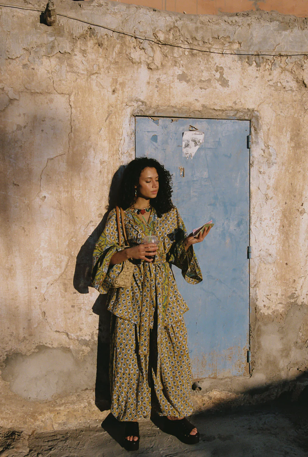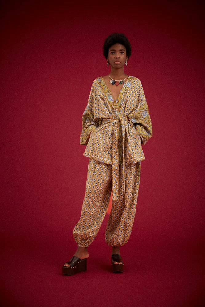 Featuring an all-over hand-style block print in earthy, sun-washed tones, the design feels collected and considered. The soft, lightweight fabrication allows for easy wear in warm weather, while the relaxed fit creates a draped, easy elegance.