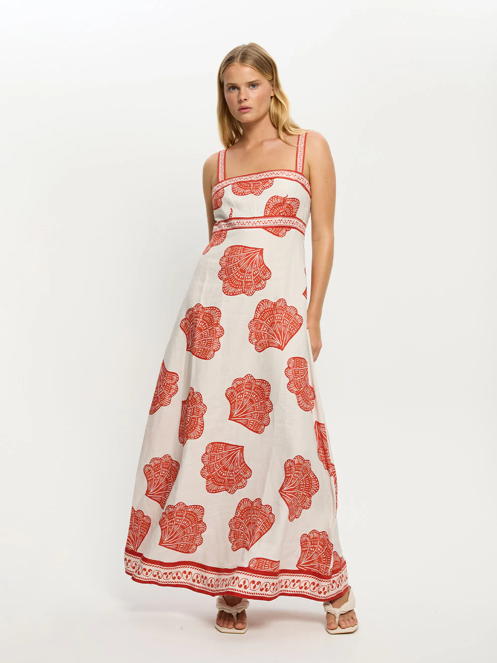 Zula is intricate red shell motifs on a crisp white base. The Zula Maxi Dress features a straight neckline with adjustable straps and a subtly flared hem, finished with a placement border print throughout. Designed to drape effortlessly, it brings refined simplicity and ease to every moment. Style with sandals for long lunches and coastal escapes.