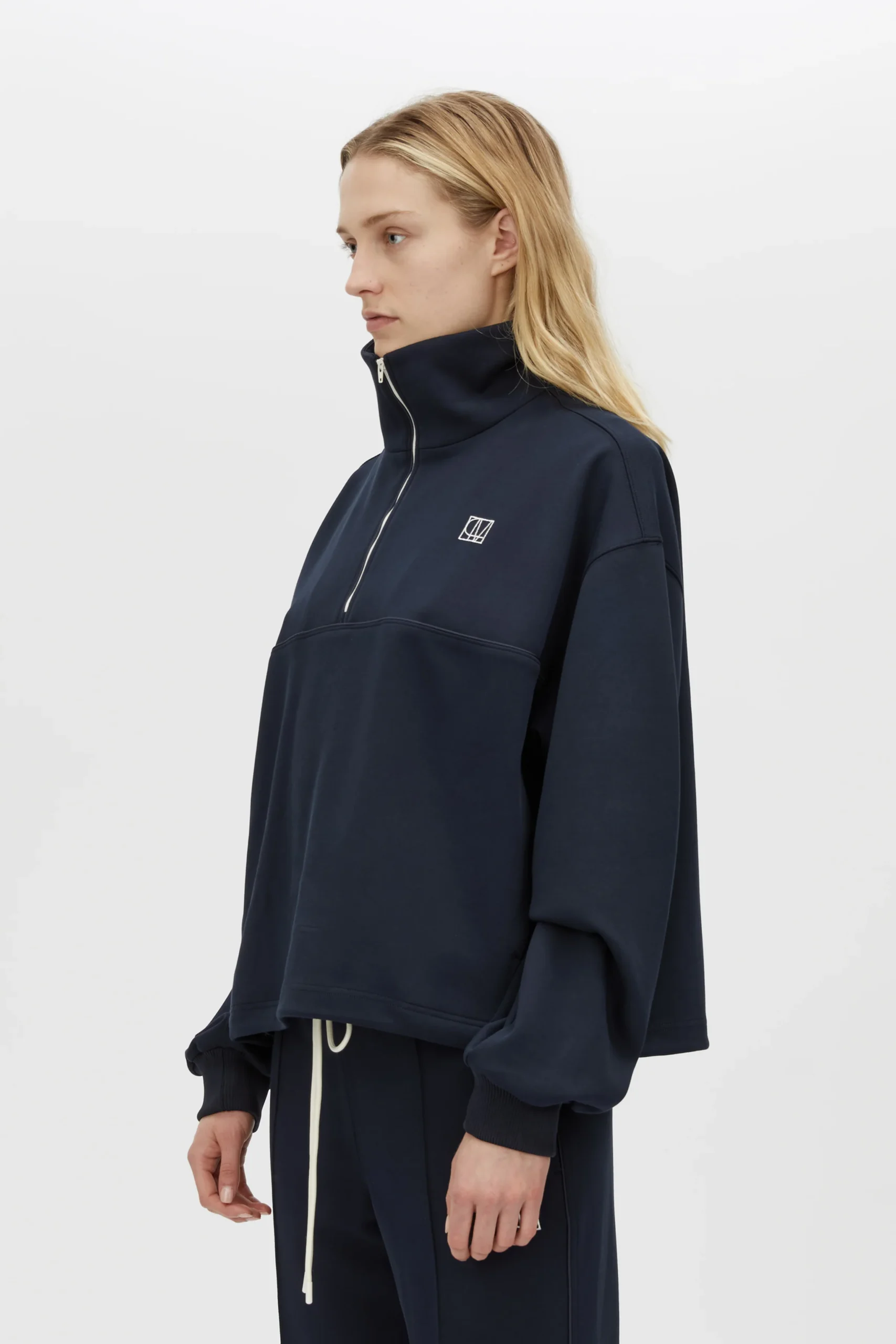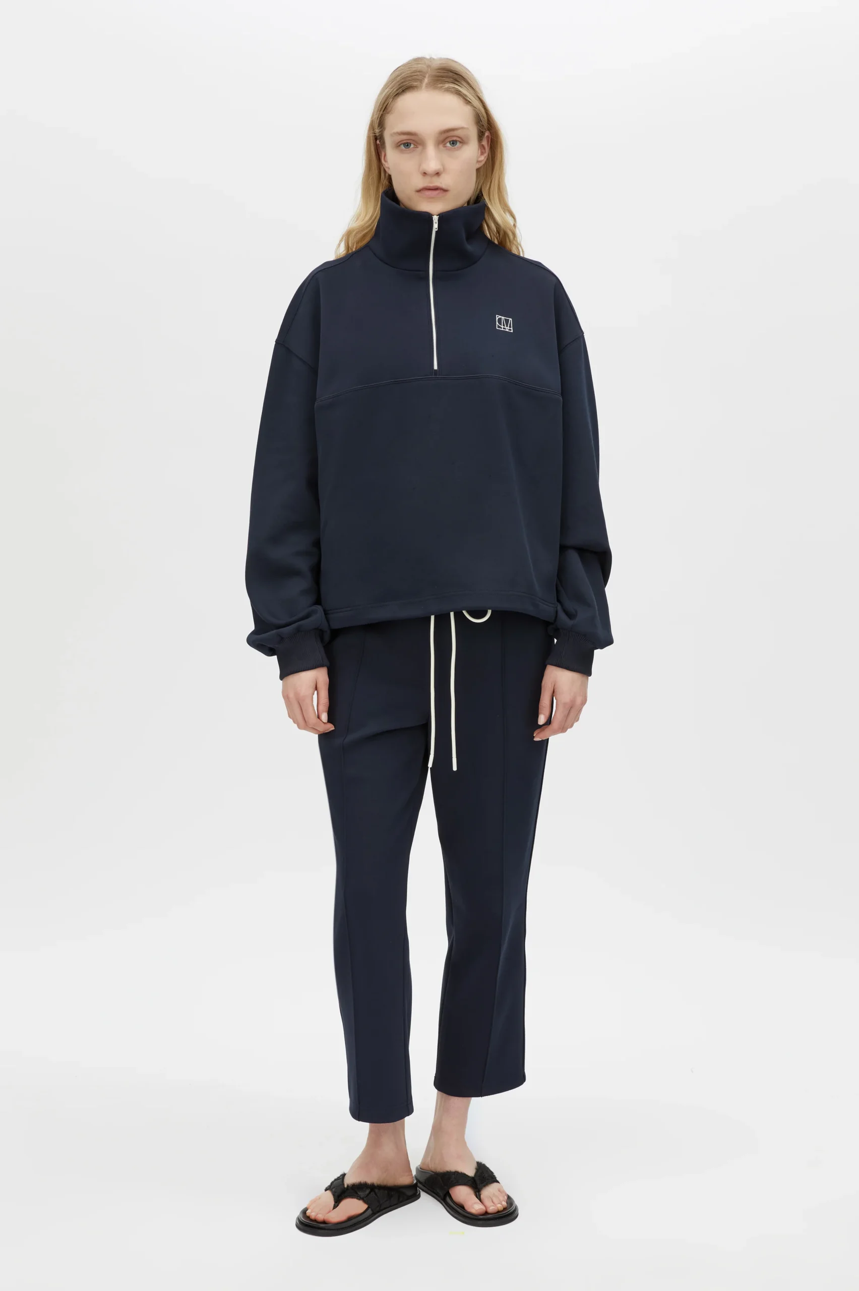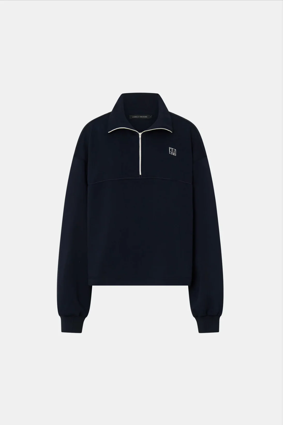 CAMILLA AND MARC Zylus funnel neck pullover sweater in navy/white with contrast embroidered monogram. Piping, inseam pockets, concealed elasticated drawcord at hem. Brushed fleece interior.